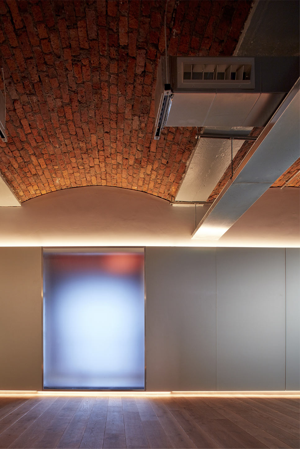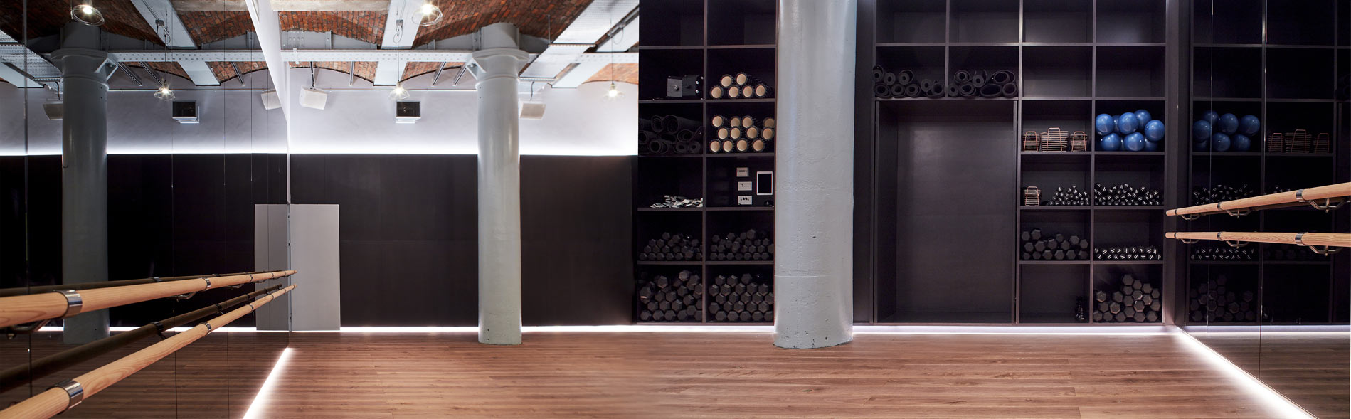 The studios are neatly packed into the brick arched vaults, with careful ambient lighting as the main character of the interior – particular care and attention is given to bringing natural light into the site. Included in the scheme are reception, retail, studios for ballet, pilates and yoga, changing and locker spaces. Dance studios have muted careful gentle light and shielded spaces whilst work – out studios have gritty transparency with the city of Manchester framed in the window view. All are inspired by the industrial heritage of the building with concrete, timber and metalwork as the main palette.