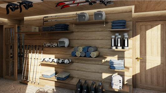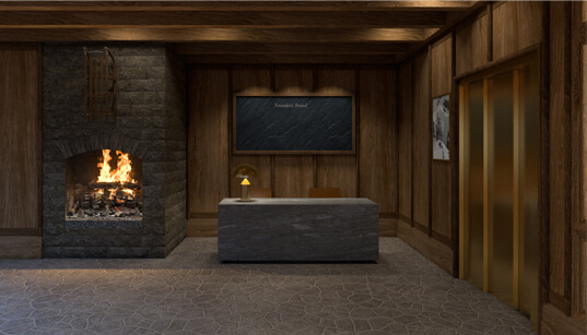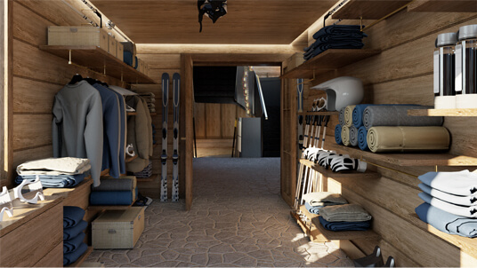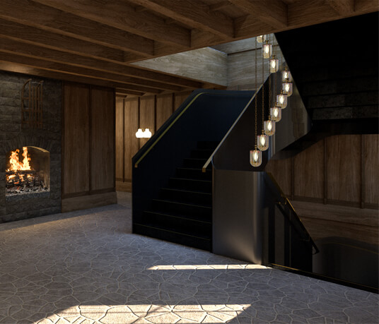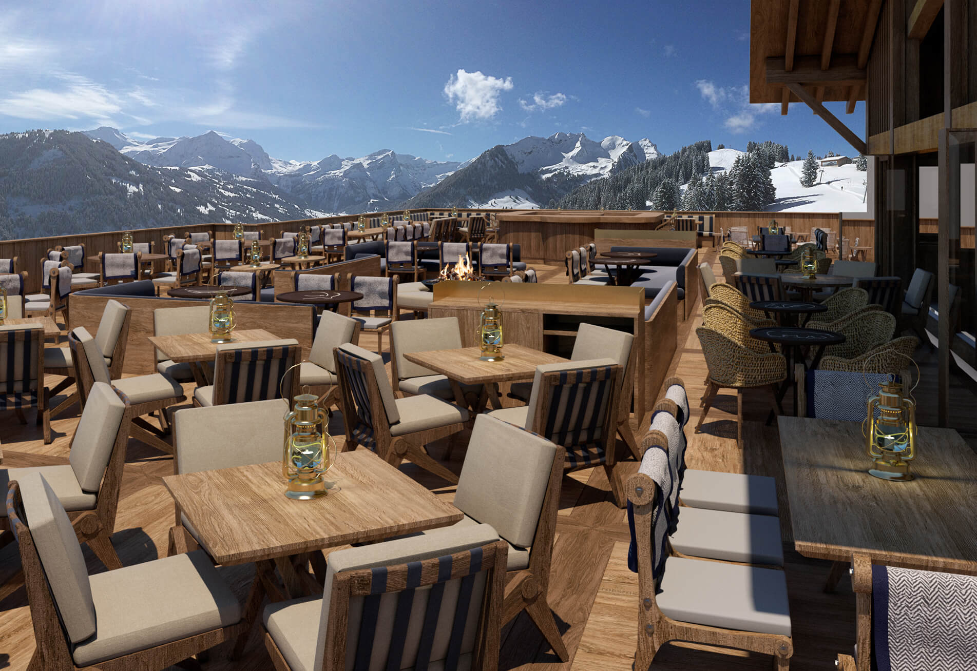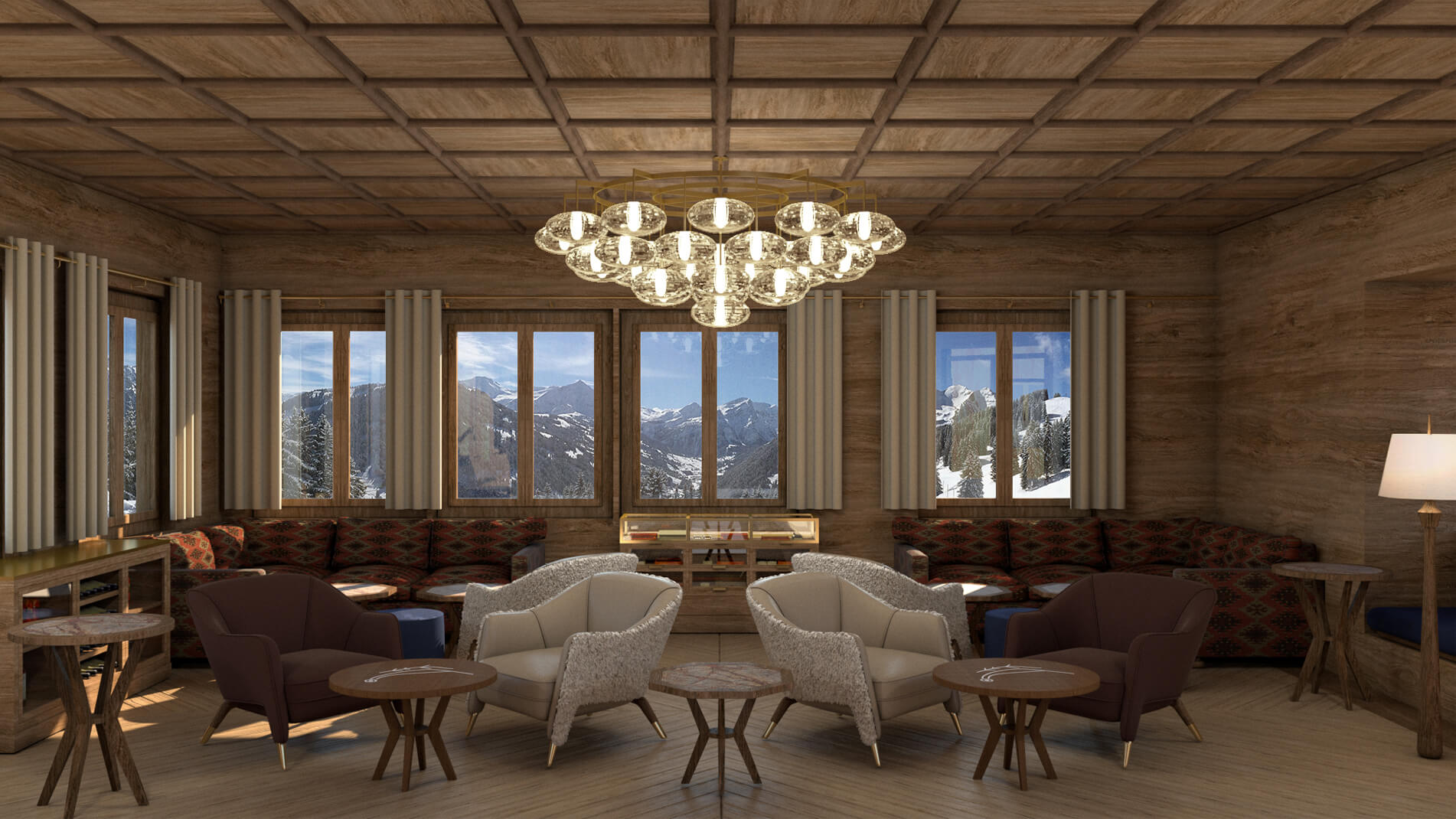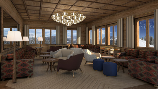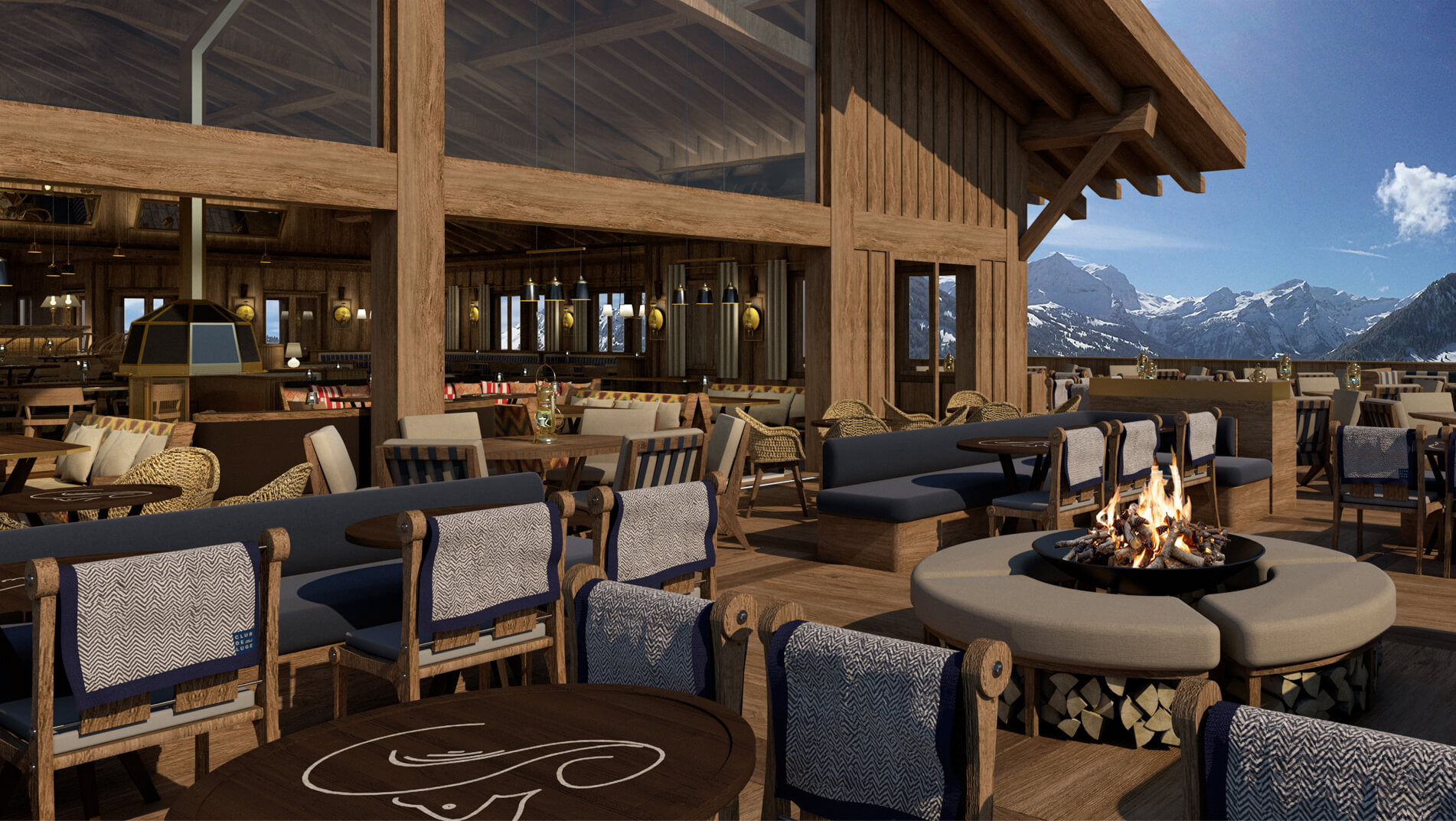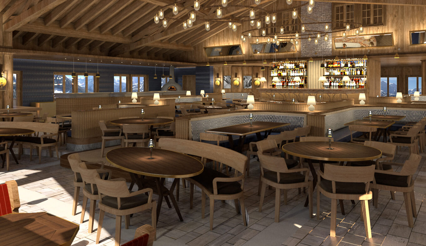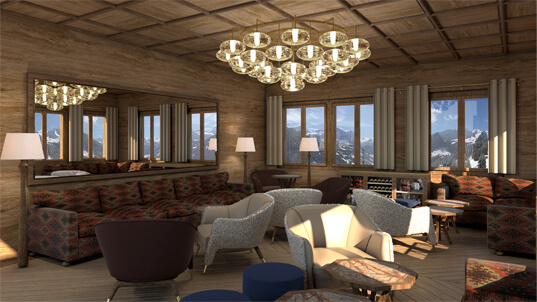 Interior design and the concept for the Club de Luge was to create an activated dynamic dining and party scene for the high - flying and ‘fabulous.’ At the centre is a bar which is the heart of the ‘chalet barn’ with a large gable vista with the alpine panoramic as a backdrop. With furniture designed by Archer Humphryes to create a glamourous interlude in the Swiss escapist destination, colours include `Tobacco, Earth, Midnight Blue and Olive Green with brass accents and fabrics from Loro Piana and Pierre Frey.