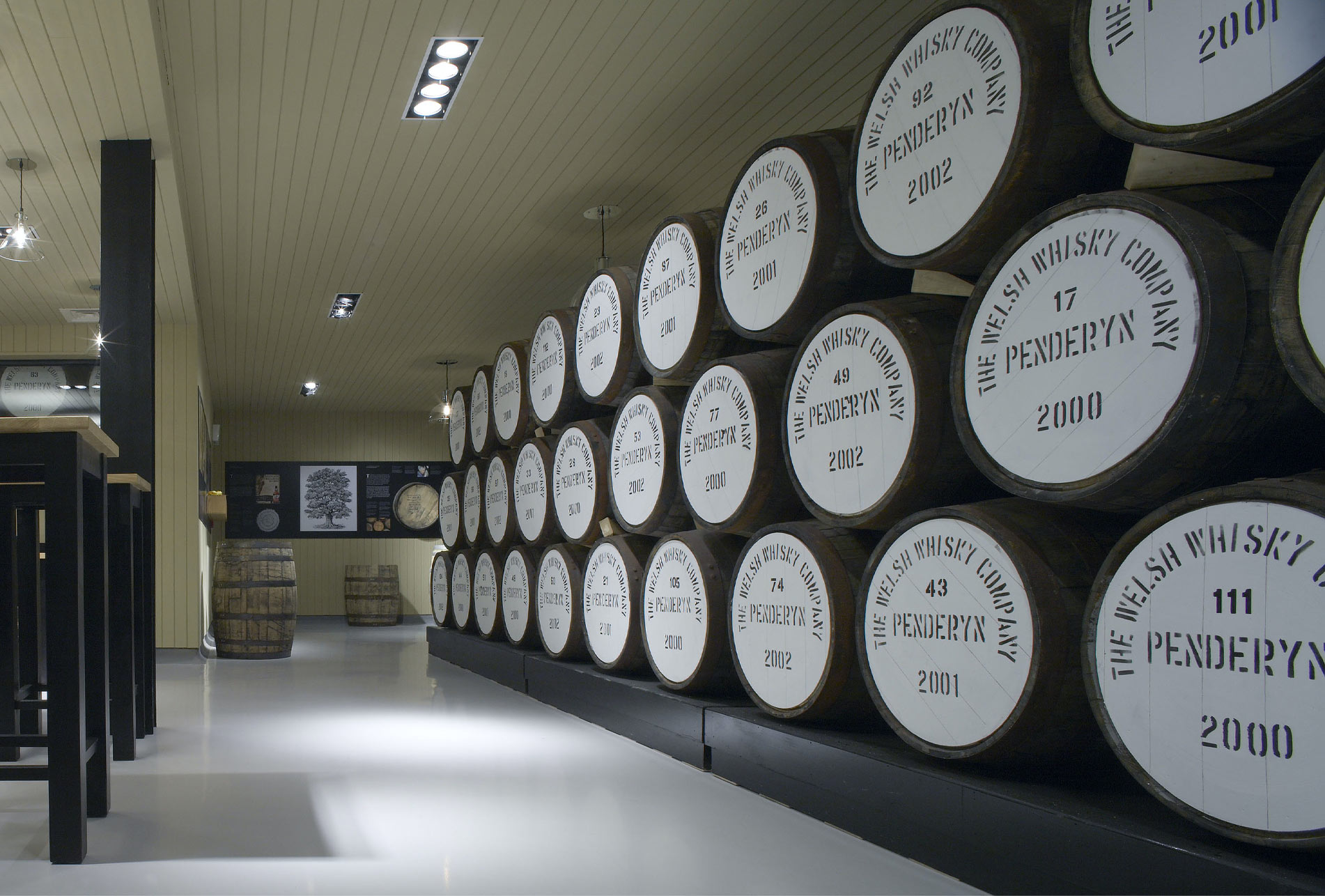 Whisky barrels and the Madeira casks, or barriques, used for the whisky’s final maturation, are incorporated into the interior design as a memory and reference point. Stacked to act as space dividers—guiding visitors through the space to a tasting bar—their monochromatic, cylindrical forms and graphic notations are a counterpoint to building’s austere organisation. The caskets add depth and rhythm to vertical walls and continue the refined use of timber in the interior spaces. The tasting bar is made of black Welsh slate with a gold seam inlay, displaying an array of visual ornamentation characterised by the whisky bottles filled with amber coloured ‘spirit’ . The design provides views from the tasting areas into the still, bottling area and cooperage store, allowing aromas to be drawn in, absorbing the rich bouquet from the whisky and sherry soaked casks used to add extra flavours during the ageing process.