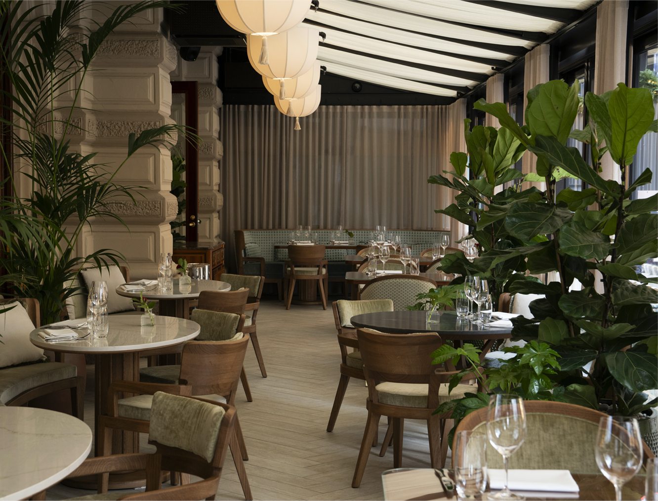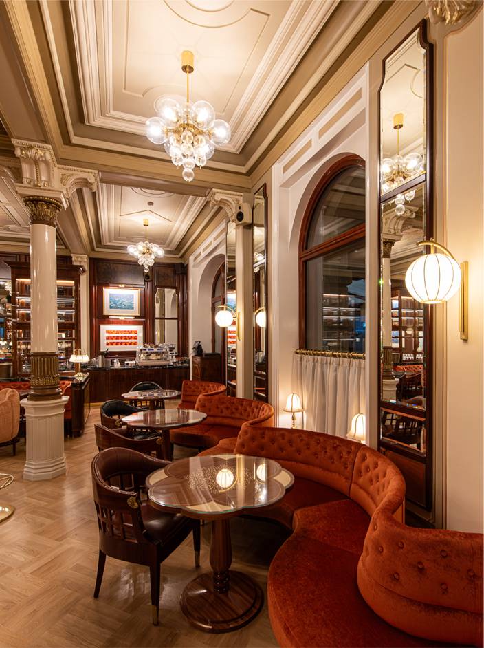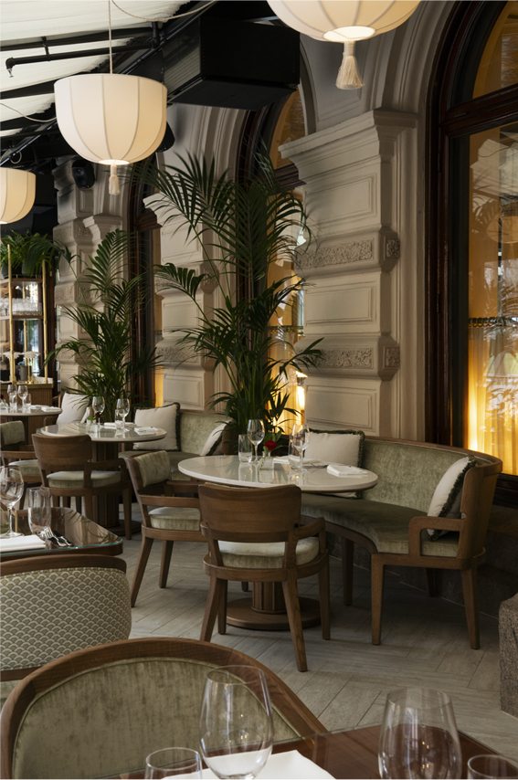 The design, led by Archer Humphryes Architects, reflects the studio’s long-standing provenance in placemaking within historic buildings, where heritage becomes the foundation for new experience. Here, the vision brings together what press coverage describes as “the elegance of Neoclassicism, the organic sensuality of Art Nouveau and the optimism of the Belle Époque,” weaving restored architectural character with refined contemporary detail. Polished mahogany, marble, satin brass and soft velvets create a layered material palette that feels both grand and intimate. A standout feature is the Winter Garden terrace, a glassed-in space overlooking Esplanade Park that is fully openable in summer, allowing the brasserie to spill out into the city’s most iconic promenade and creating a seamless connection between interior elegance and Helsinki’s outdoor life.