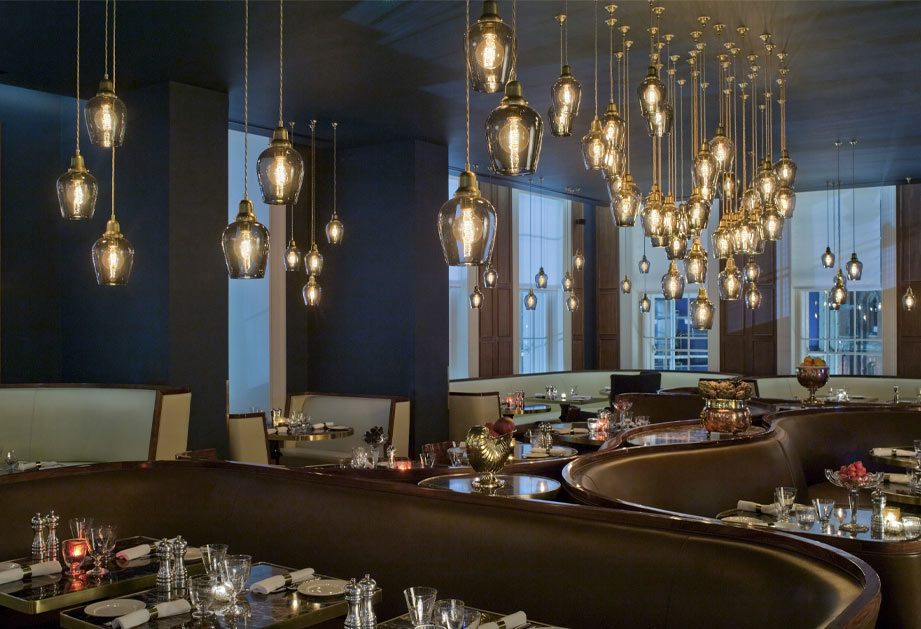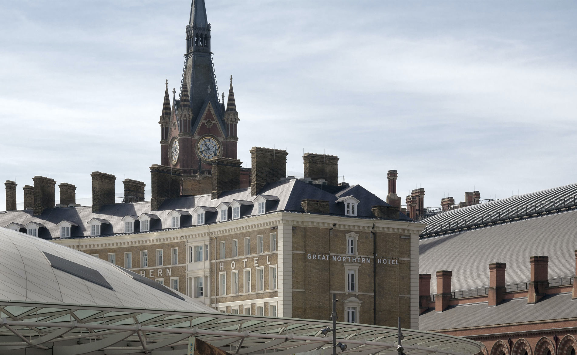 On the first floor is the Plum & Spilt Milk restaurant, named after the distinctive dining livery of the Flying Scotsman. This theatrical space, lit by 150 hand-blown transparent glass lanterns, gives breath-taking views of George Gilbert Scott’s iconic clock tower at St Pancras and the new piazza. Laid out with continuous curving seating combined with black tables of cracked lava from Mount Etna, a Hague Blue colour backdrop selected to match historic enamelled railway signage. “The panel described Plum & Spilt Milk Restaurant at The Great Northern Hotel as stand out project for its exquisite finishes and clever space planning, that allows all diners to have a great seat and views over neighbouring St Pancras station. The vintage yet modern design adds warmth to an all-day restaurant in a class of its own.” European Hotel Awards 2013, Winner Evocative of the Orient Express, bedrooms and furniture have been designed to resemble carry cases heading to the Orient and the Sahara. Bathrooms decorated with herringbone slate and porcelain tiles, are reminiscent of classic Victorian Bathrooms. By removing traditional trappings of a hotel room, a luxury, sophisticated environment has been created.