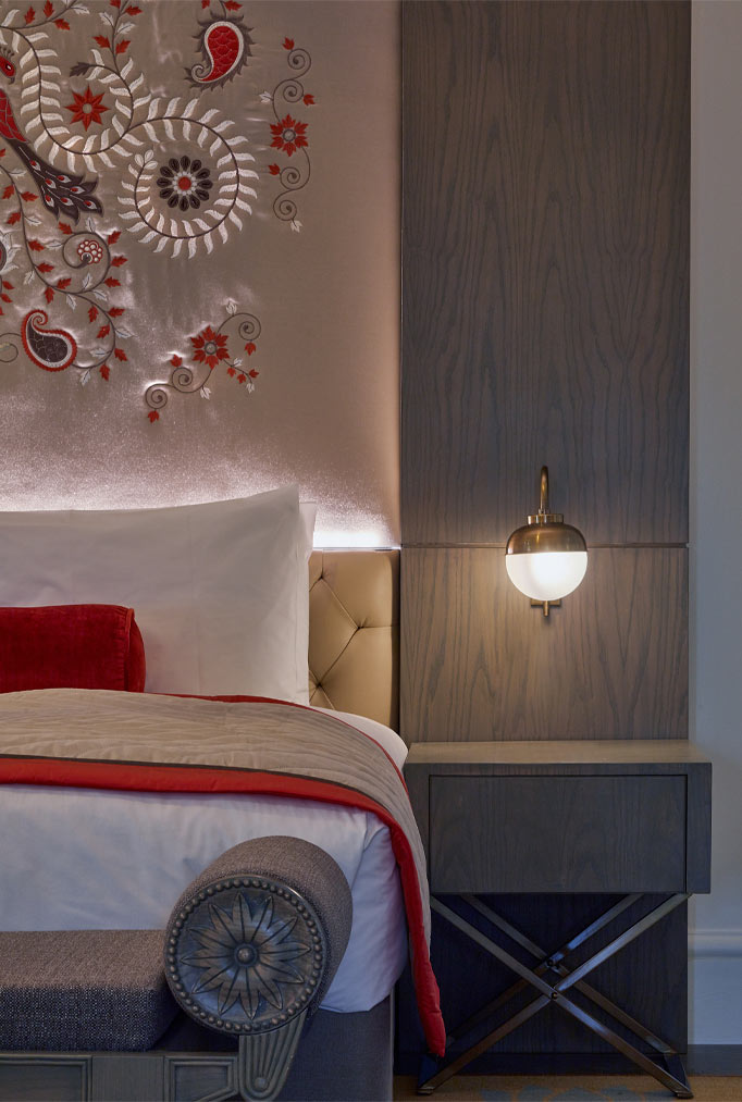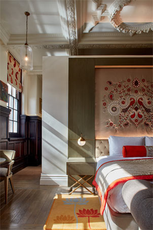 Inside the bedrooms the designers created a rangoli tapestry—reminiscent of the golden ‘Peacock Throne’—where the relief forms the bedheads in every room with applique silk tapestries made by seamstresses in Delhi. Fodor’s capture this as ‘English Heritage meets Indian opulence” where the designers have paid homage to the scholastic origins. The biggest success of the project is the planning achieved by Archer Humphryes where they revivified the urban realm into a flourishing district formerly derelict.