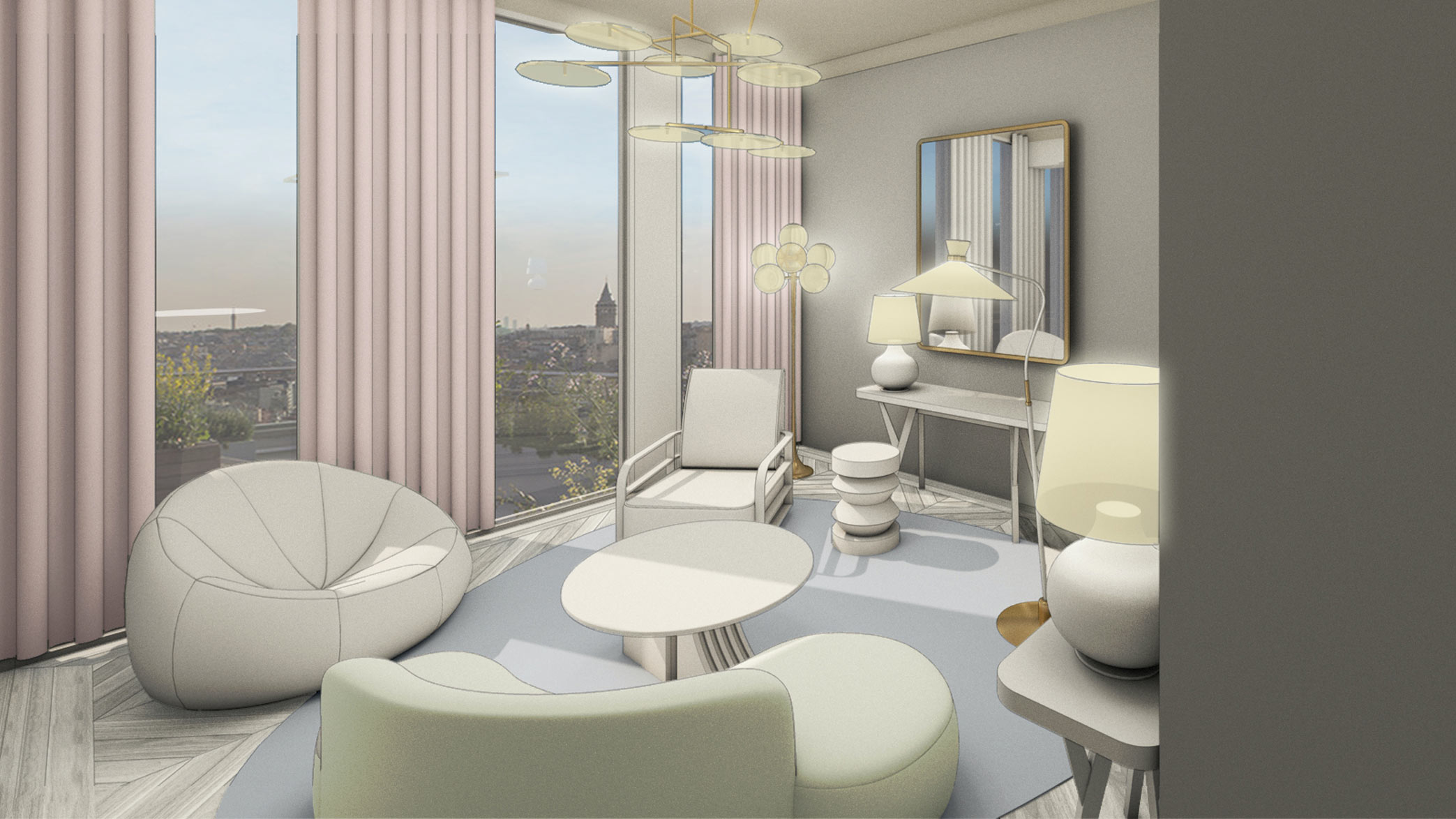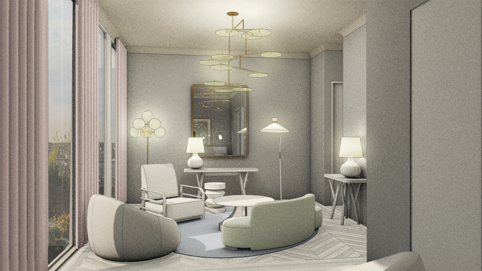 Bedroom Suites were simple in palette with soft pinks and Lulworth blue. Floors were formed off chevron parquet in bleached oak. Soft upholstered furniture with curvaceous backs and elliptical forms centred in the rooms, created a sitting room experience that takes full advantage of the generous floor to ceiling glazed perimeter wall.