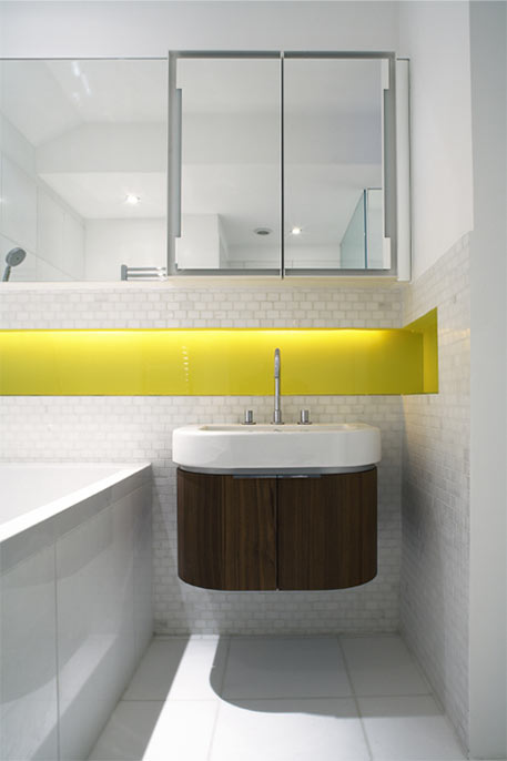The bathrooms have been extended and reconfigured within the existing demise, using Thassos marble, glass mosaics and coloured glass. The original cellular kitchen has been removed and the space revitalised as a study and library. A new open plan kitchen now resides at the heart of the flat, providing a flexible environment for entertaining.
