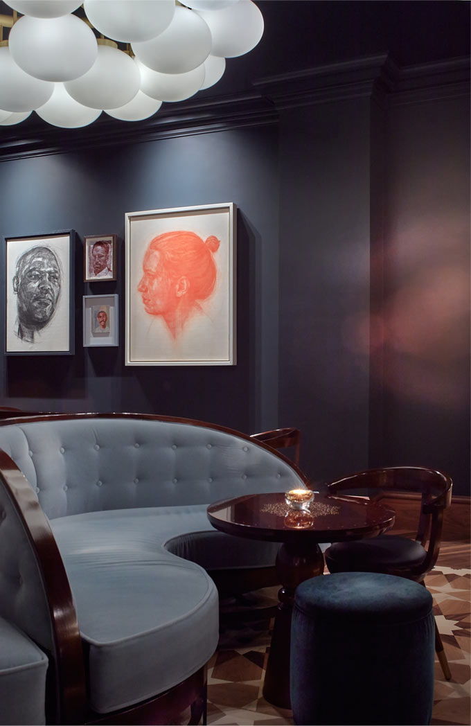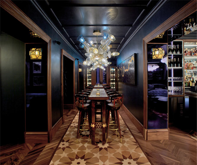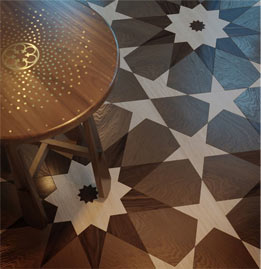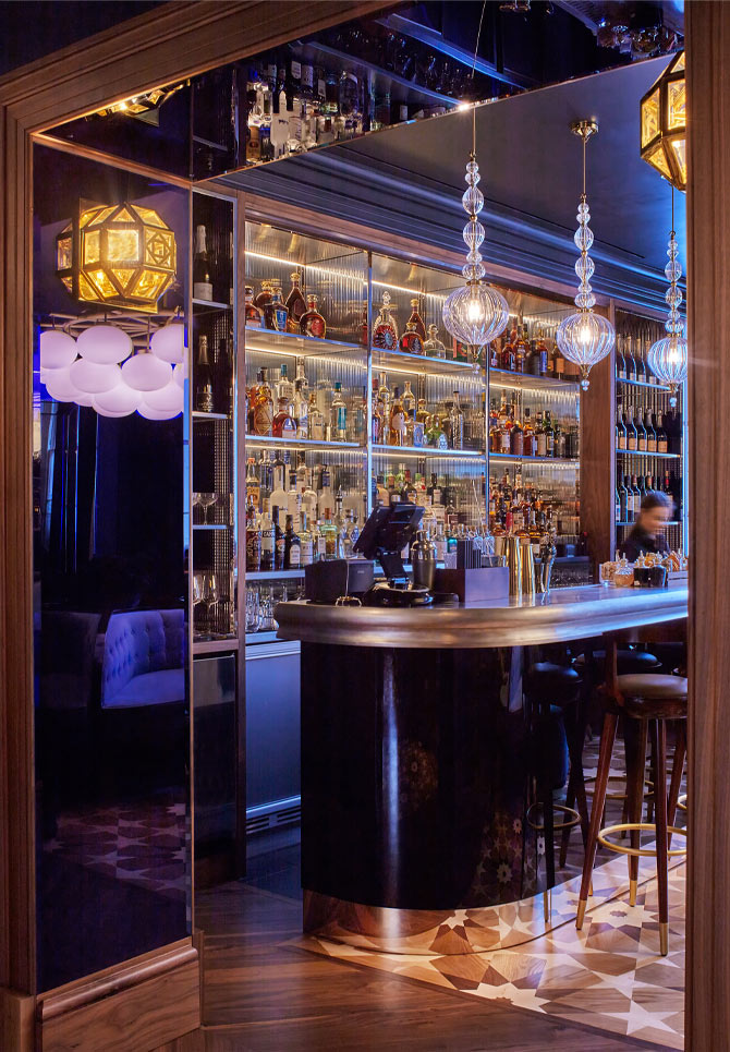 The challenge was to be the best chic bar and lounge in London. To create the concept for Anthracite Martini Lounge it required a timeless response that would blend and feel at home in the hotel. Evoking the style and glamour of the first railway age.- emphasising the historic character of the building while at the same time providing an elegant, contemporary design was the result. Starting with the entry space, the floor pattern in walnut, maple and oak was inspired by historical geometric patterns. The tessellation of stars on the floor provides a striking background that retreats in the hierarchy of the rooms, allowing other motifs- including the star sofa and bar to be prominent. When the furniture is occupied and the tables glistening with crystal and cocktails - the floor is the showcase. Interlaced with the geometry is the history of travel during the industrial revolution by train. Initially heading through the Simplon pass into Venice, then further afield to Istanbul, Syria and Iraq, Anthracite is an attempt to absorb the bygone era of the Belle Époque an overarching ambition for the hotel design concept.