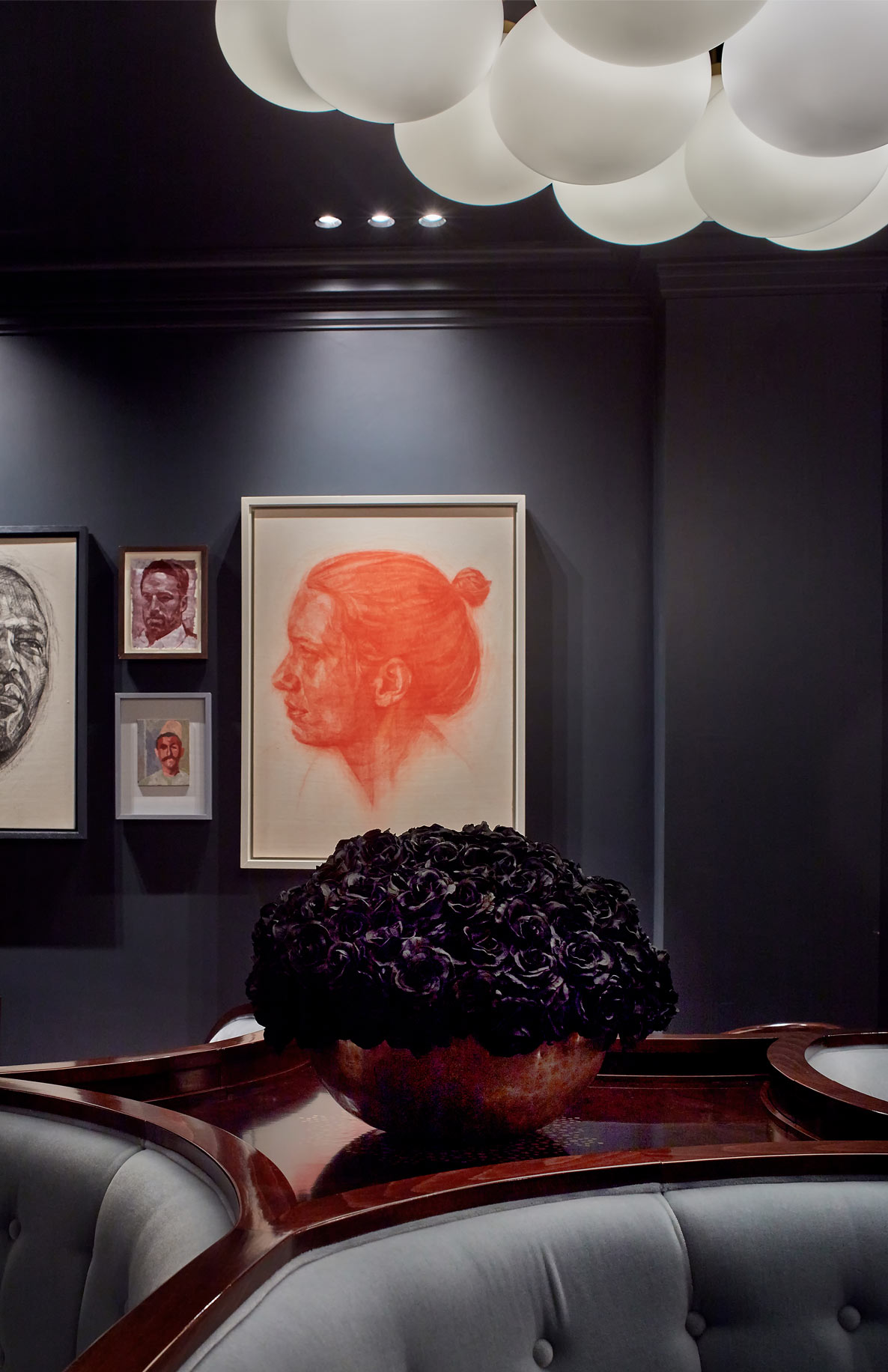 Inspiration for the colours are: Italy, Florence, ‘A Room with a View’ by EM Forster. Railway travel allowed grand tours to be more immediate. Travelling to Belle Époque interiors with European furniture, dark green velvet drapes, exotic marbles, seafoam velvet, chocolate or ivory leather, polished timber, brass, mirrors and lighting was the essence of the day. The electric blue of the mirrored glass was inspired by the magnum Provence rose bottle served at Eden Roc in St.Barths which captures sunlight and bounces around in the glass and a chic ambience. Throughout - combining craftsmanship of furniture design and boiserie, it was important that the furniture Archer Humphryes designed was expressed as integral with the space.