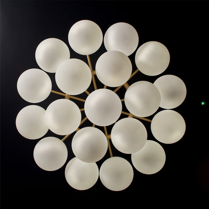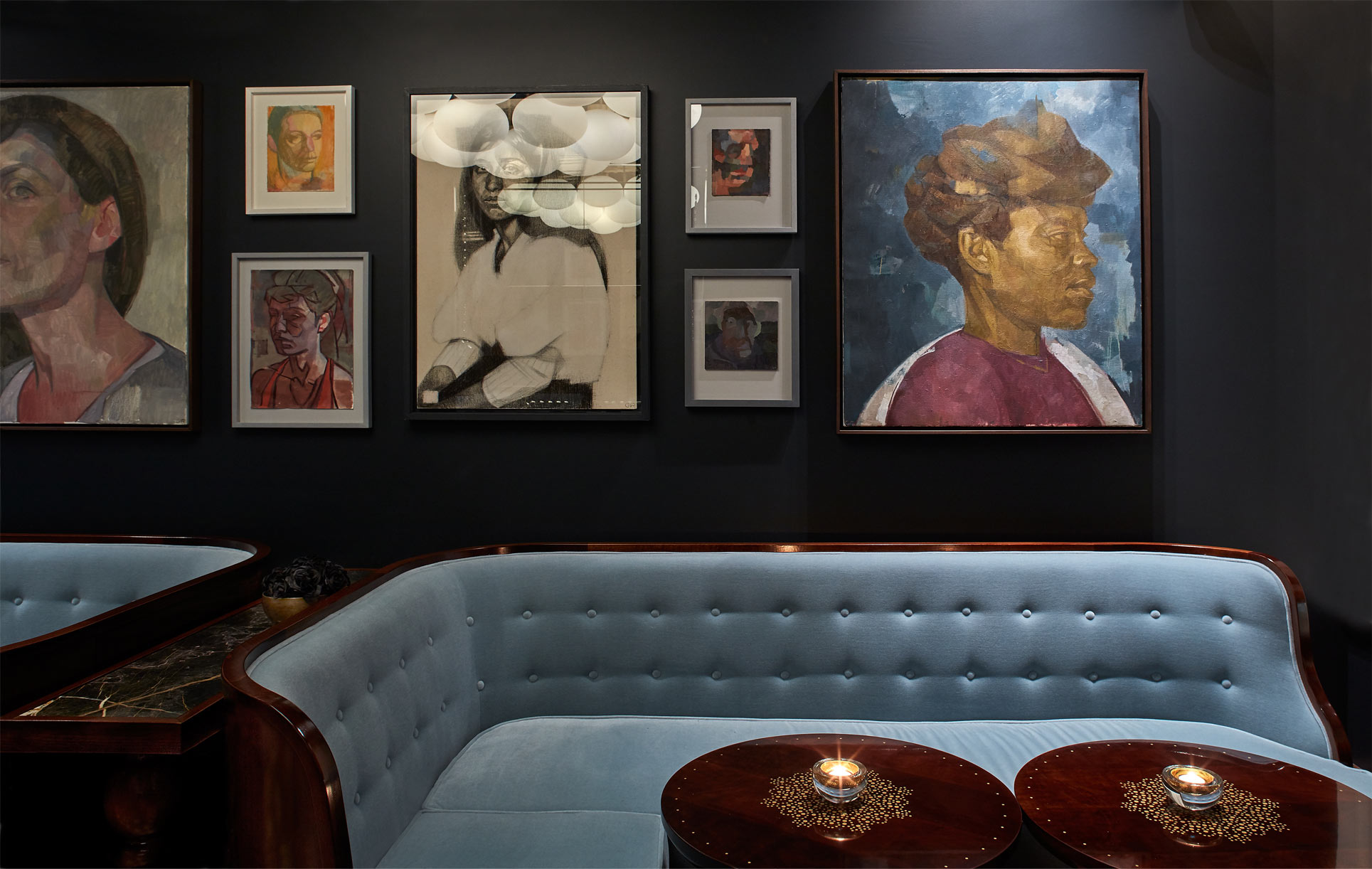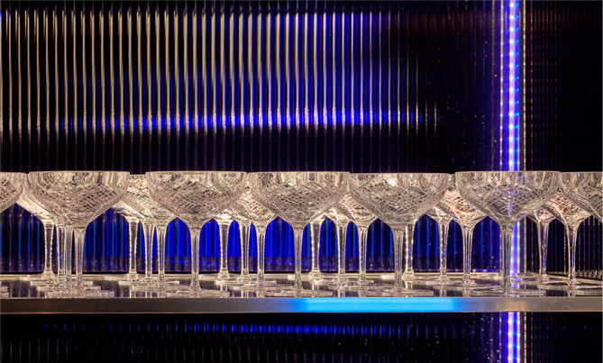 Main stand out features include: Quatrefoil high tables with marble inlay and traced brass: starfish central banquette designed in seafoam blue velvet: and opalescent Murano white spun glass chandeliers that form eye catching light to glaze over the interior.