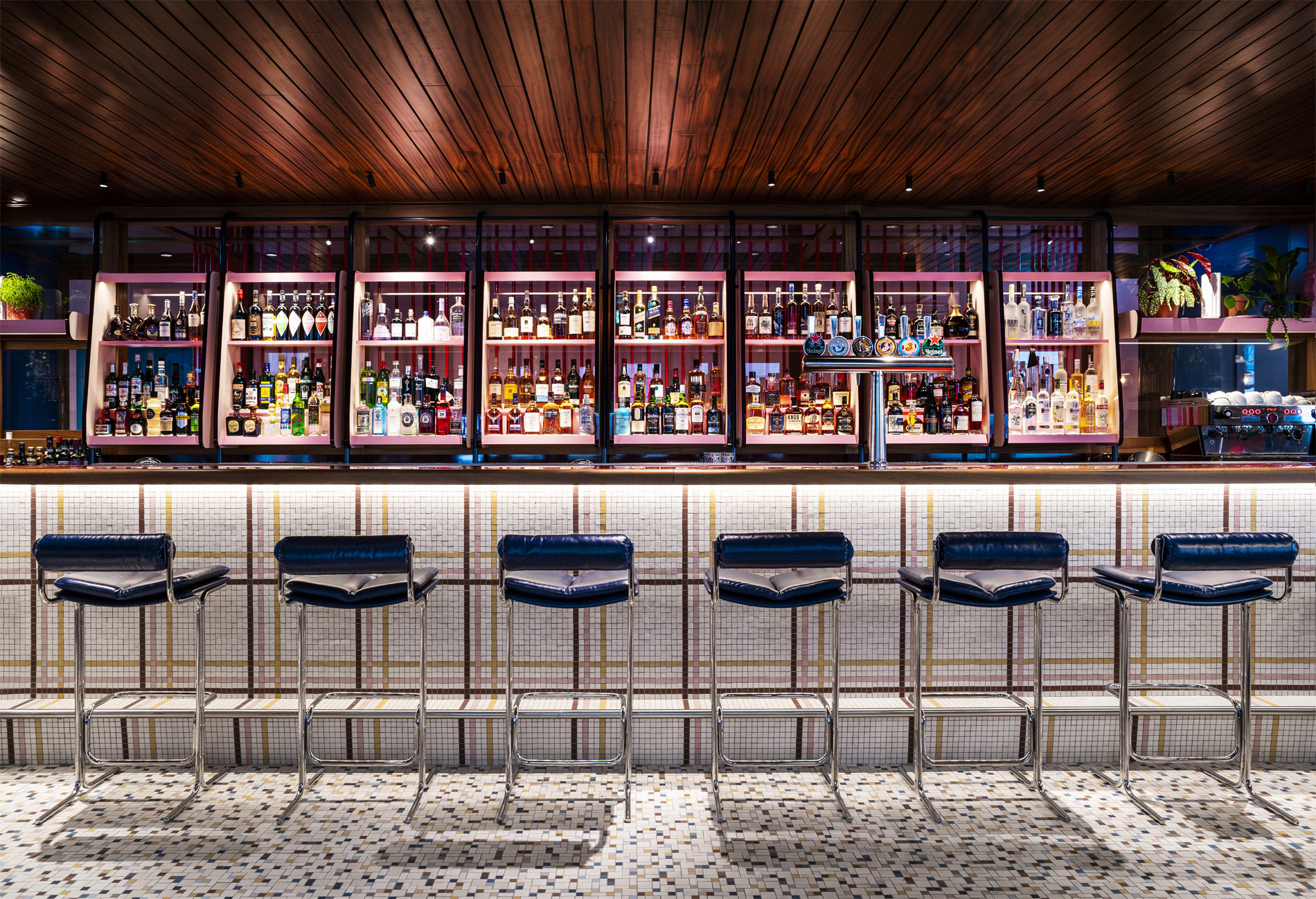 Meanwhile, Double Standard is the ground floor’s most boisterous space. With a menu inspired by traditional pub classics and New York City dive bar food, the standalone bar serves craft beers, wine and classic cocktails alongside Dawson’s menu, which runs late into the night. Heavy-set wooden doors, textured glass and TfL-inspired upholstery encapsulate the feeling of a British local, whilst pastel tiled flooring, rounded soft pink shelving and an exposed felt ceiling create a modern and playful feel.
